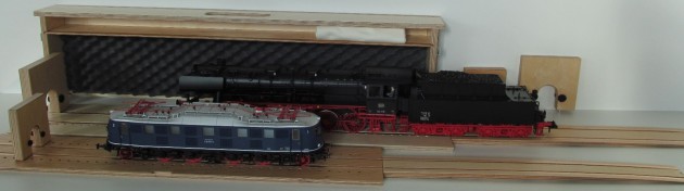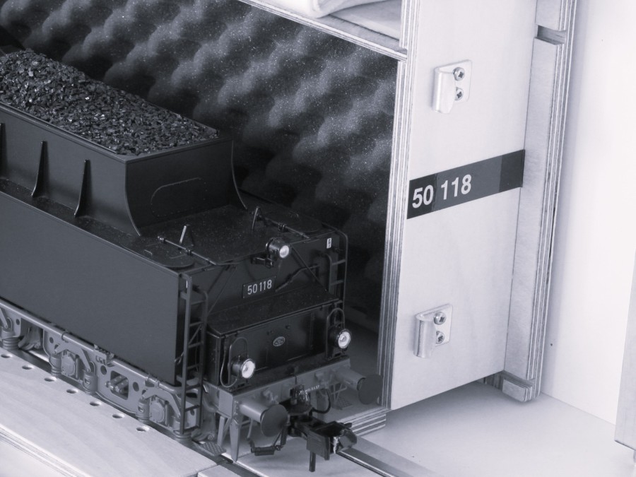 (!! Zwischen Lok und Schaumstoff bitte unbedingt Baumwolltuch oder Ähnliches einlegen!!) - Alle Koffer mit Ablagefach für Auffahrkeil und weiteres Zubehör